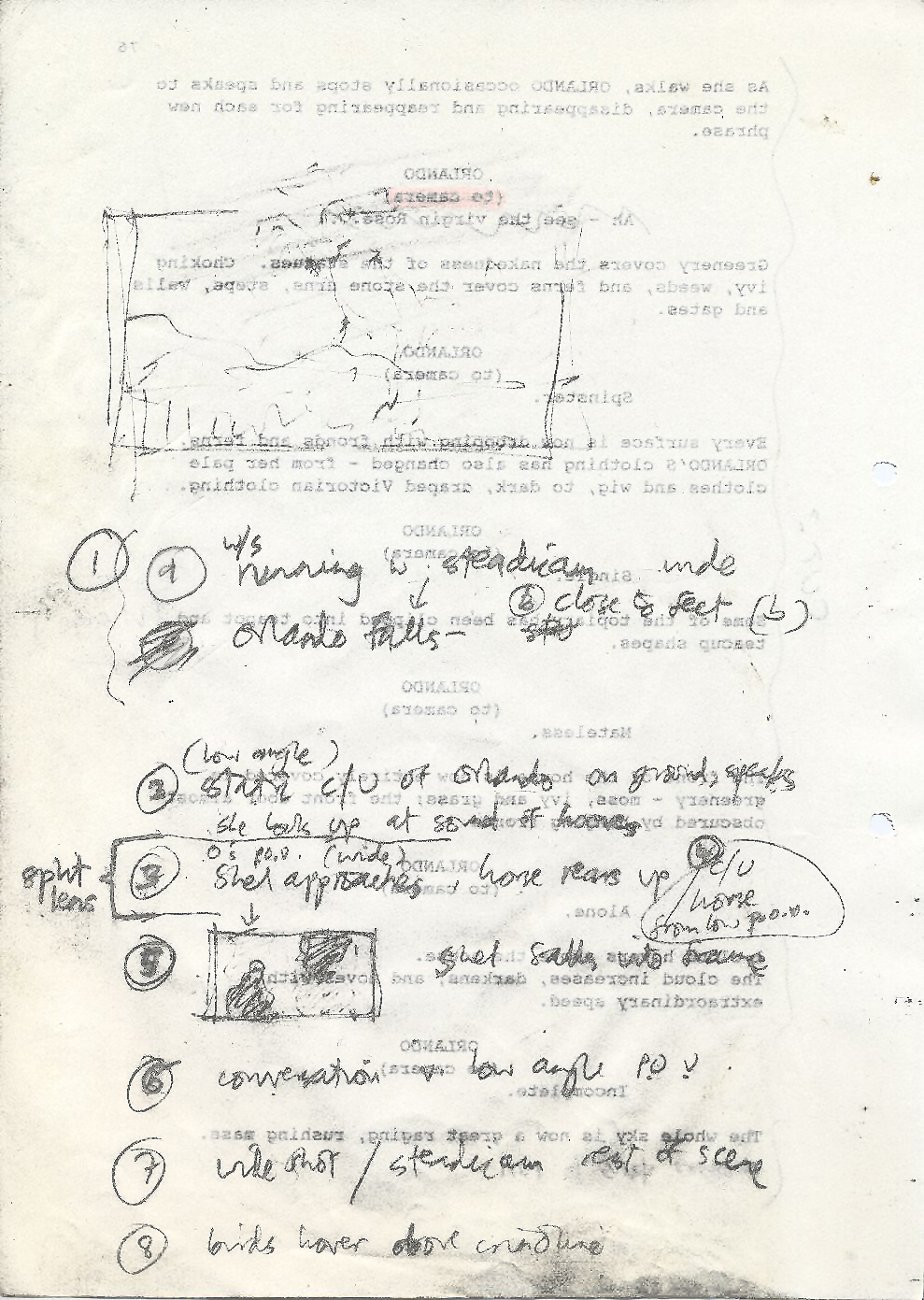 Description Black and white A4 computer printed with handwritten annotations, bound into book, Paper, Orlando Sally Potter’s Shooting Script page 76 back