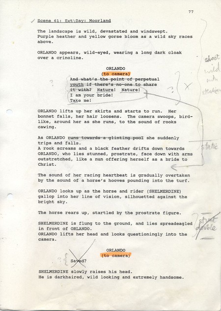 I compiled various assets about how Orlando looks at the camera. While I was watching the film, I noticed that it was a specific stylistic choice. By sifting through the documents, this knowing look from Orlando meant to address the viewers. In Sally Potter's commentary, she explains the direct look exemplifies a “kind of release… a kind of flying out of the historical period right into the present moment." These random moments when Orlando looks at the camera brings a sense of knowing and feeling that the viewers can relate to.