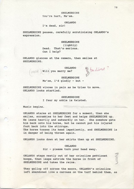 Description Black and white A4 computer printed with handwritten annotations, bound into book, Paper, Orlando Sally Potter’s Shooting Script page 78 front