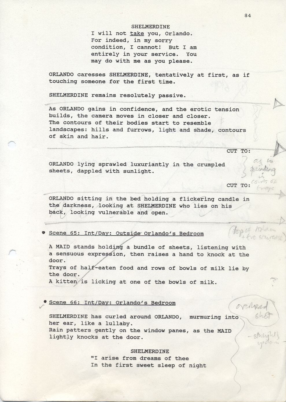 Description Black and white A4 computer printed with handwritten annotations, bound into book, Paper, Orlando Sally Potter’s Shooting Script page 84 front