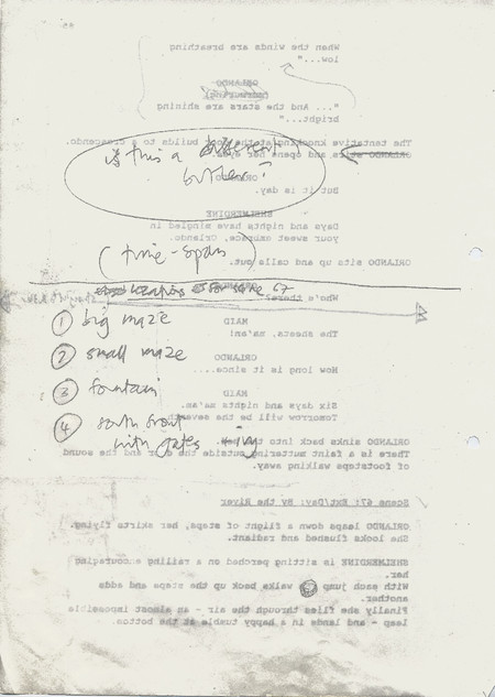 Description Black and white A4 computer printed with handwritten annotations, bound into book, Paper, Orlando Sally Potter’s Shooting Script page 85 back