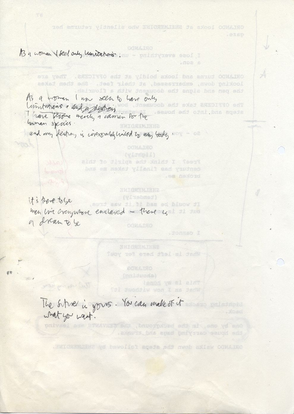 Description Black and white A4 computer printed with handwritten annotations, bound into book, Paper, Orlando Sally Potter’s Shooting Script page 87 back