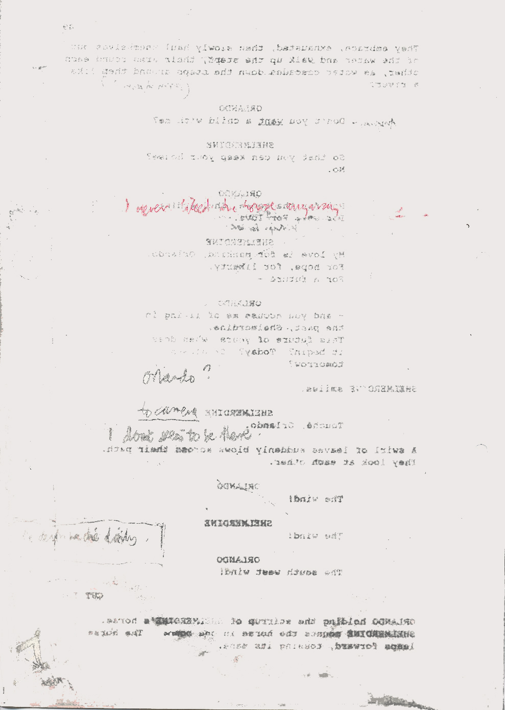 Description Black and white A4 computer printed with handwritten annotations, bound into book, Paper, Orlando Sally Potter’s Shooting Script page 89 back