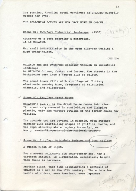 Description Black and white A4 computer printed with handwritten annotations, bound into book, Paper, Orlando Sally Potter’s Shooting Script page 95 front