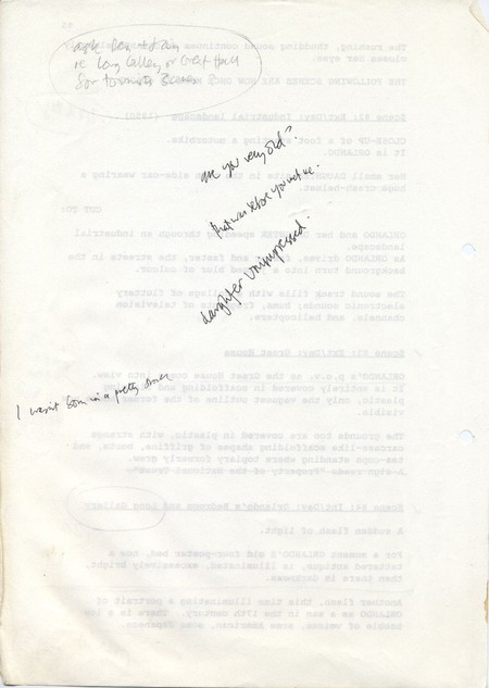 Description Black and white A4 computer printed with handwritten annotations, bound into book, Paper, Orlando Sally Potter’s Shooting Script page 95 back