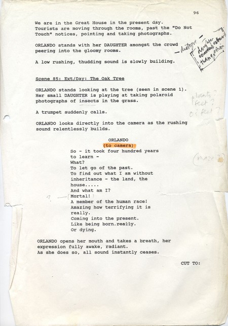 Description Black and white A4 computer printed with handwritten annotations, bound into book, Paper, Orlando Sally Potter’s Shooting Script page 96 front