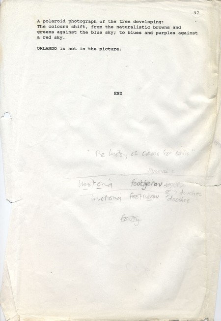 Description Black and white A4 computer printed with handwritten annotations, bound into book, Paper, Orlando Sally Potter’s Shooting Script page 97 front