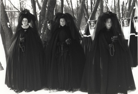 Description 8x10" black and white photograph of Clorinda, Favilla and Euphrosyne in funeral procession