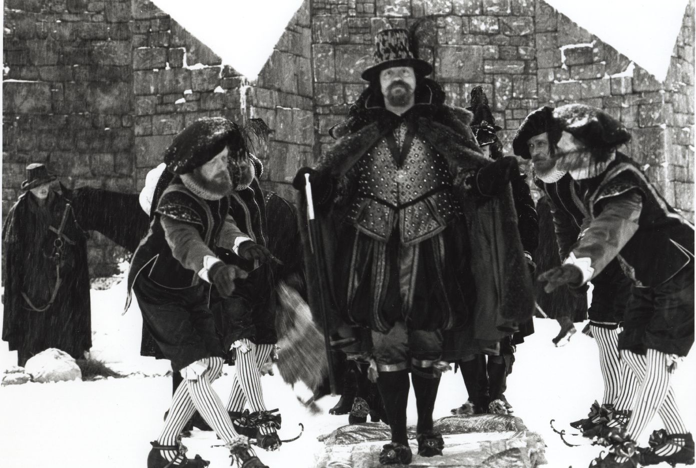 Description 8x10" black and white photograph of King James walking on silver carpet on ice
