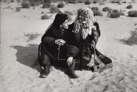 Description 8x10" black and white photograph of Orlando and the Khan drinking in desert