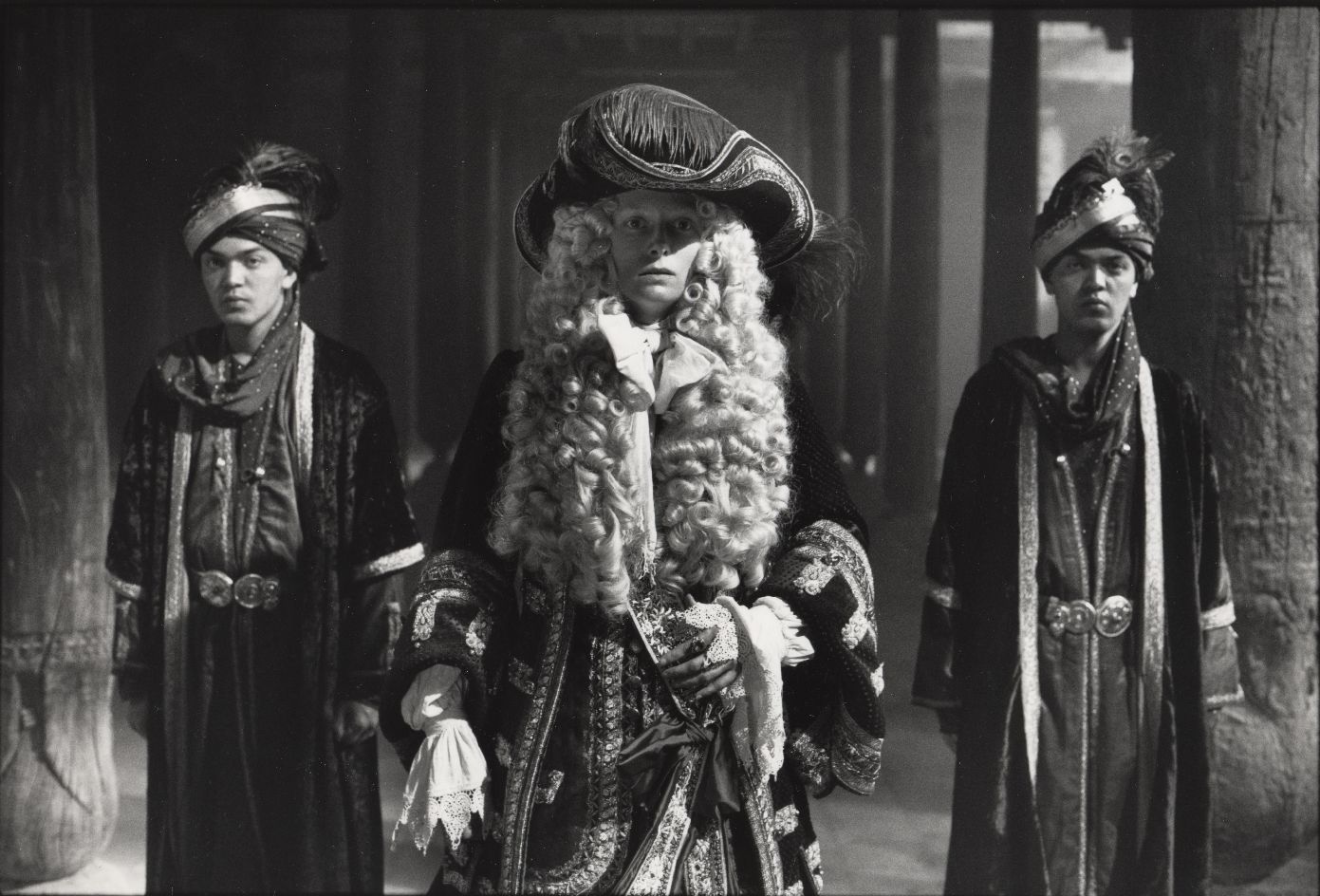 Description 8x10" black and white photograph of Orlando and two servants at Khan's palace