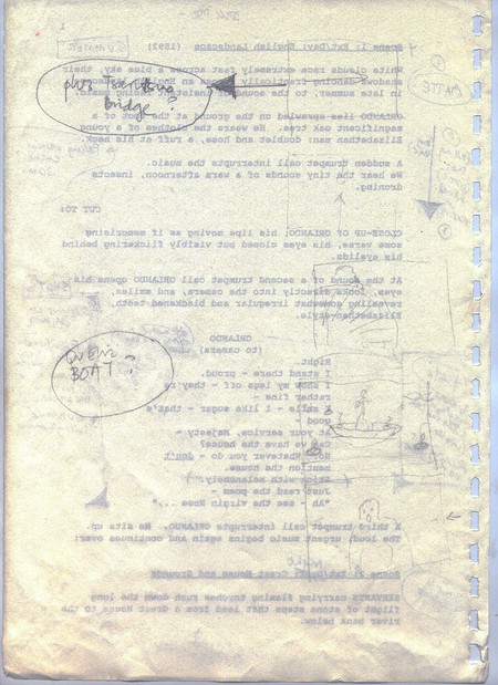 Description Revised draft script for Orlando, handwritten notes and diagrams in pencil, page 1, back