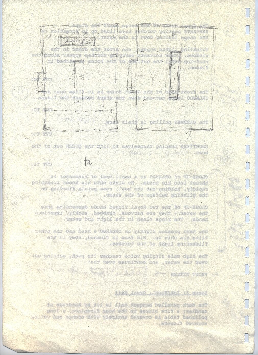 Description Revised draft script for Orlando, handwritten notes and diagrams in pencil, page 3, back