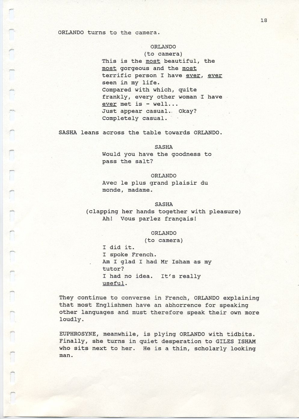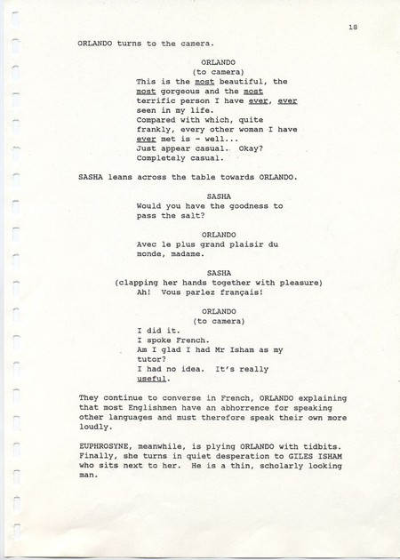 Description Revised draft script for Orlando, black printed text on white A4 paper with annotations in pencil, page 18, front
