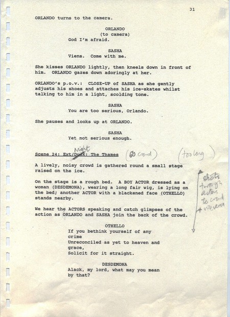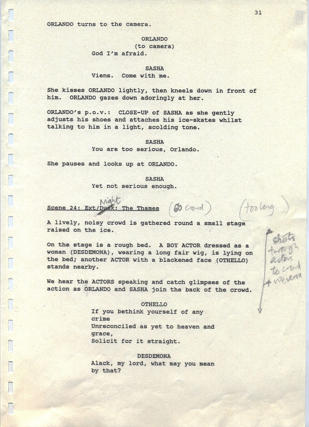 Description Revised draft script for Orlando, black printed text on white A4 paper with annotations in pencil, page 31, front