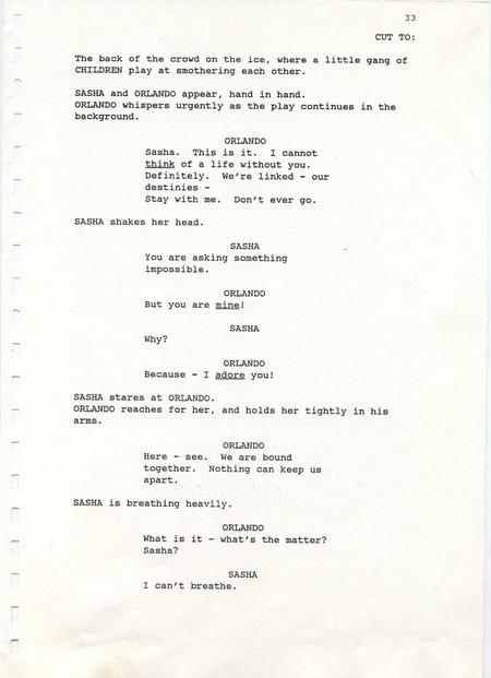 Description Revised draft script for Orlando, black printed text on white A4 paper with annotations in pencil, page 33, front