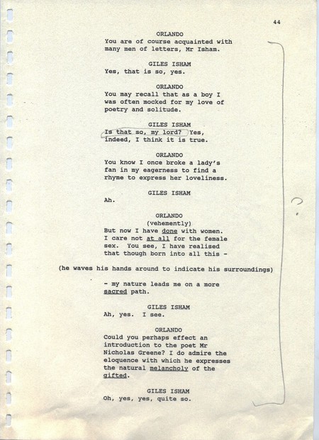 Sally Potter constantly revises her portrayal of Orlando's emotions throughout the development of the film. This pathway displays the numerous changes she decides to make, in turn shaping the cinematic character of Orlando through his/her emotive mannerisms, and will decipher as to why Potter decides to implement these changes in the ways she does so.