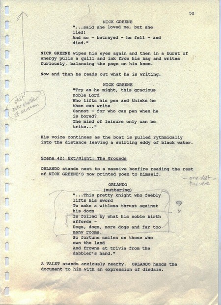 Description Revised draft script for Orlando, black printed text on white A4 paper with annotations in pencil, page 52, front