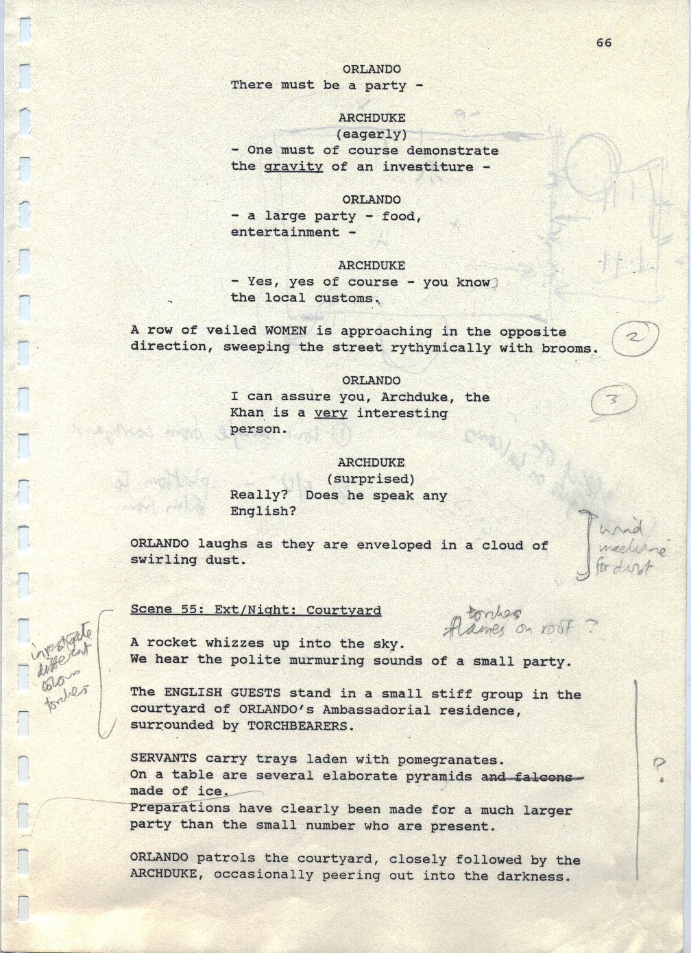Description Revised draft script for Orlando, black printed text on white A4 paper with annotations in pencil, page 66 front