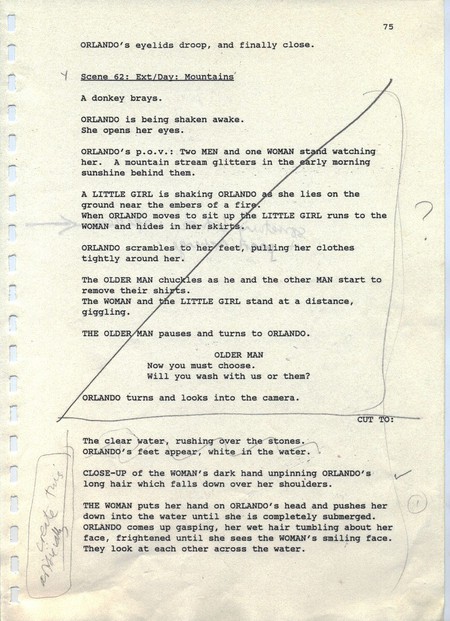 Description Revised draft script for Orlando, black printed text on white A4 paper with annotations in pencil, page 75 front