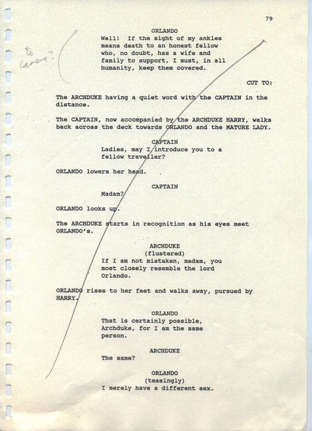 Description Revised draft script for Orlando, black printed text on white A4 paper with annotations in pencil, page 79 front