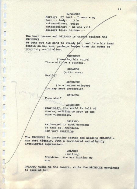 Description Revised draft script for Orlando, black printed text on white A4 paper with annotations in pencil, page 80, front