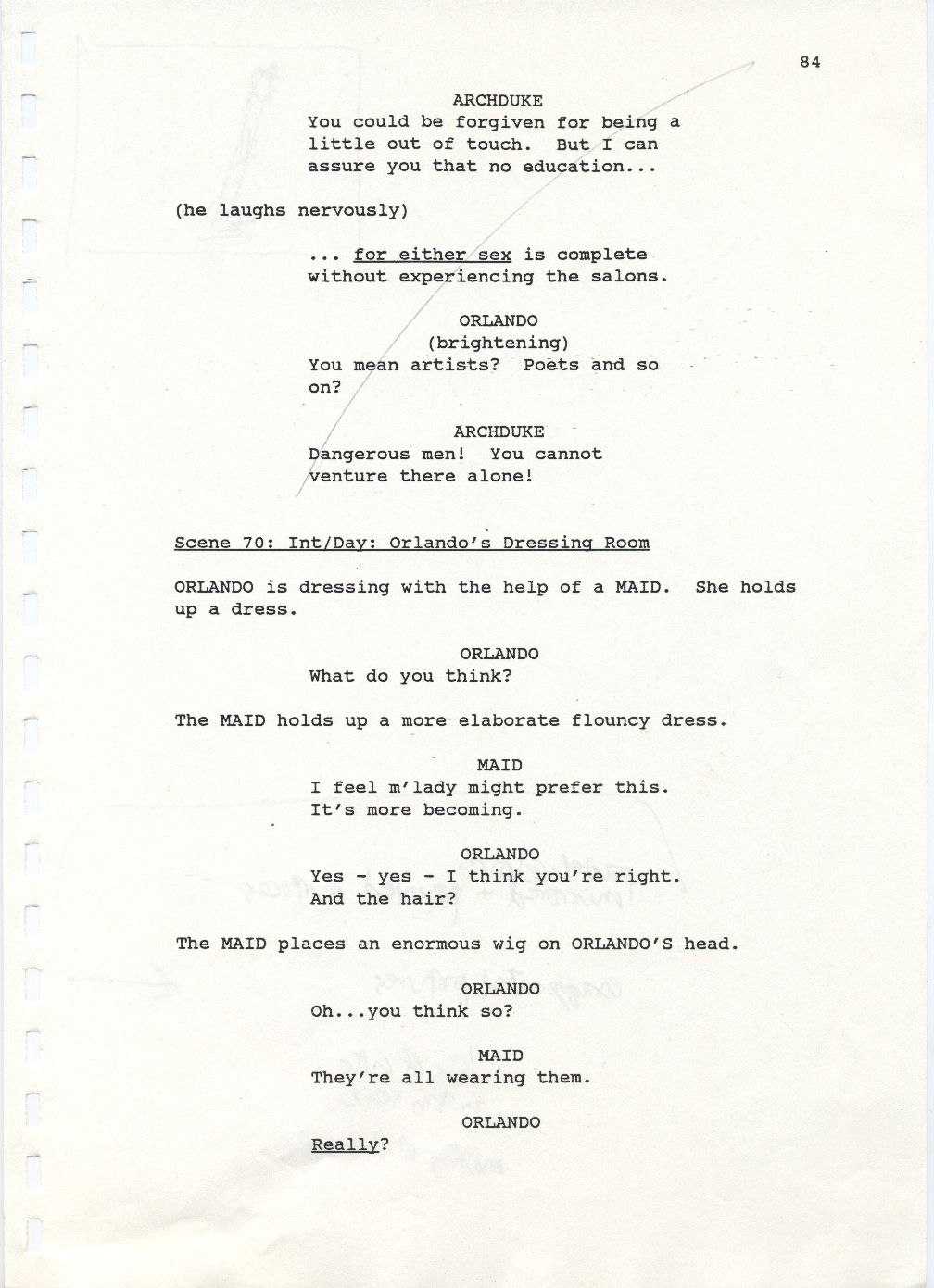 Description Revised draft script for Orlando, black printed text on white A4 paper with annotations in pencil, page 84, front