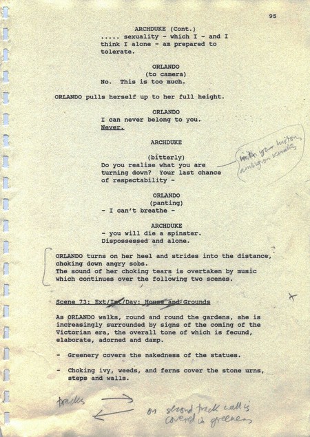 Description Revised draft script for Orlando, black printed text on white A4 paper with annotations in pencil, page 95, front
