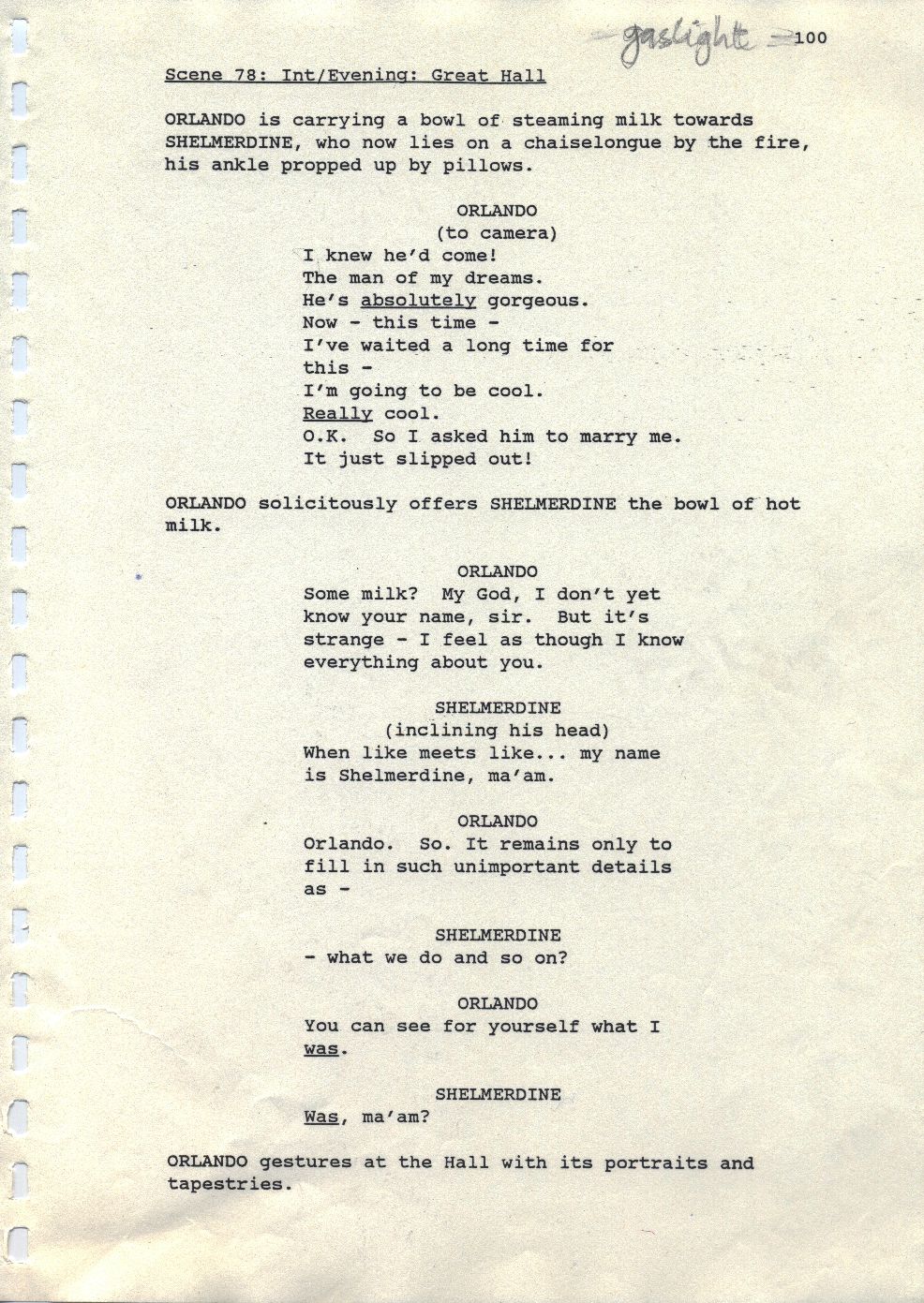 Description Revised draft script for Orlando, black printed text on white A4 paper with annotations in pencil, page 100, front