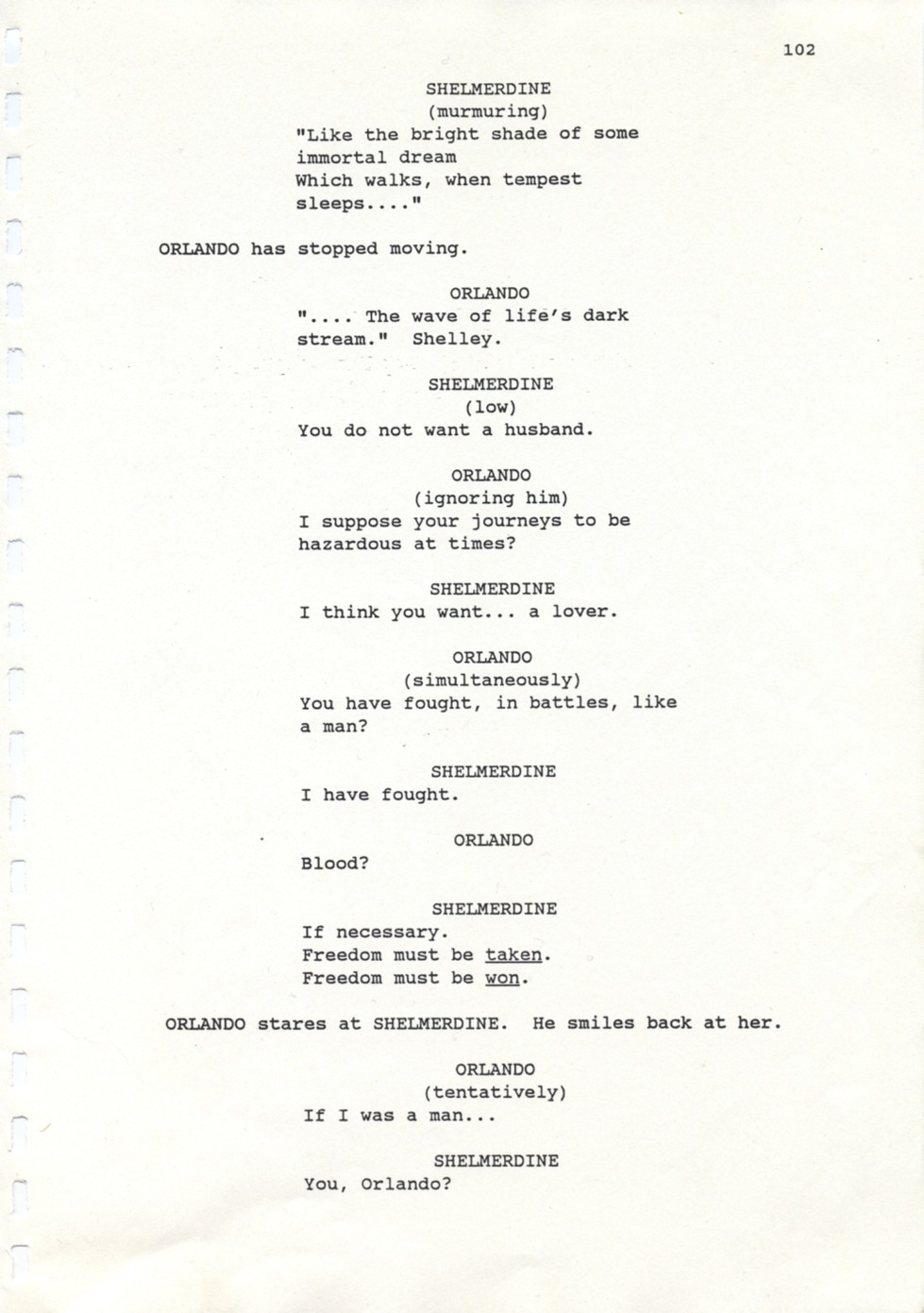 Description Revised draft script for Orlando, black printed text on white A4 paper with annotations in pencil, page 102, front