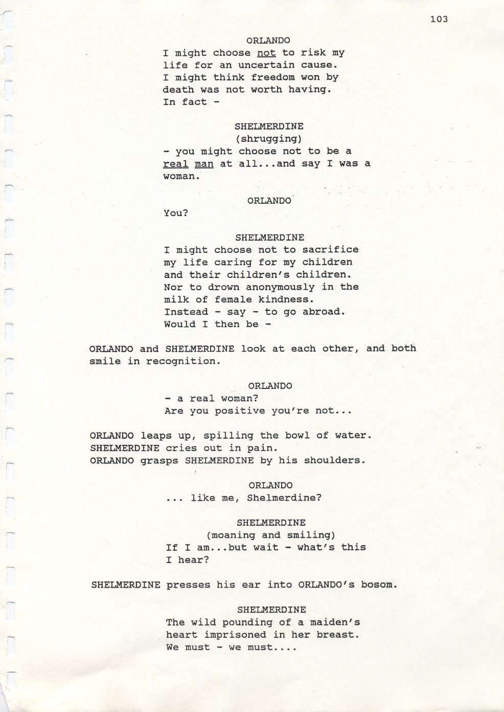 Description Revised draft script for Orlando, black printed text on white A4 paper with annotations in pencil, page 103, front