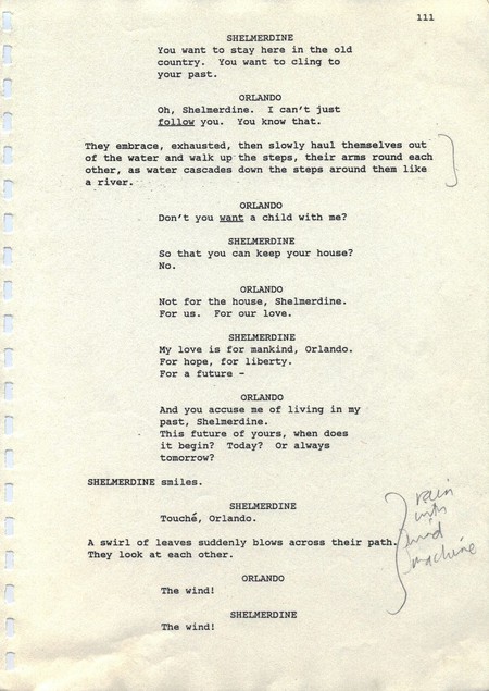 Description Revised draft script for Orlando, black printed text on white A4 paper with annotations in pencil, page 111, front