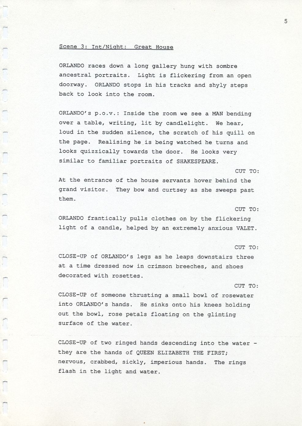 Description Page 5 of revised draft script for Orlando. Black printed text on A4 paper bound with a plastic comb spine