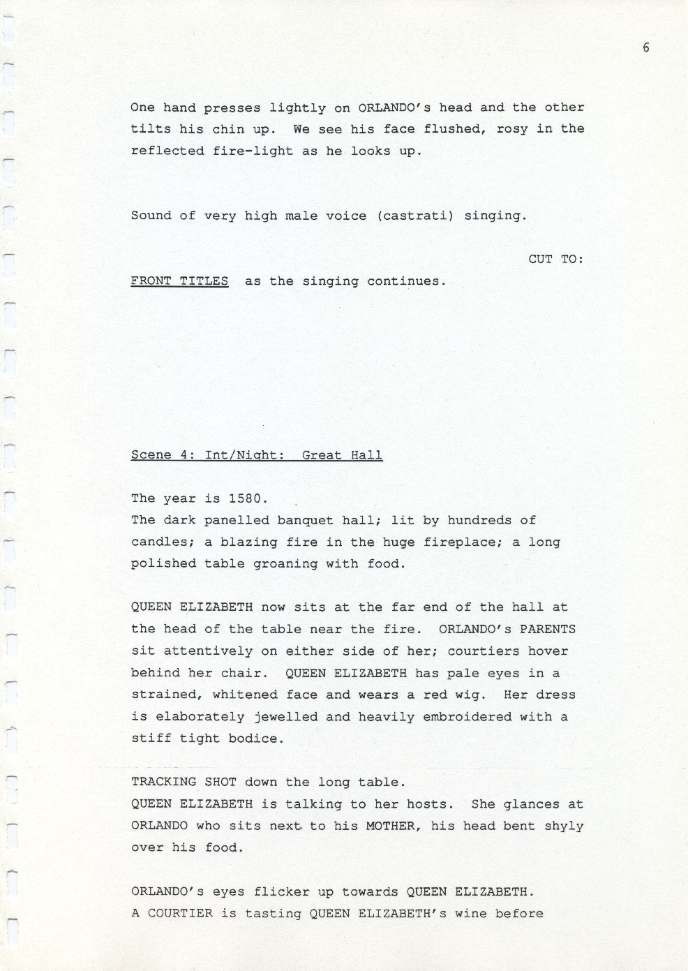 Description Page 6 of revised draft script for Orlando. Black printed text on A4 paper bound with a plastic comb spine