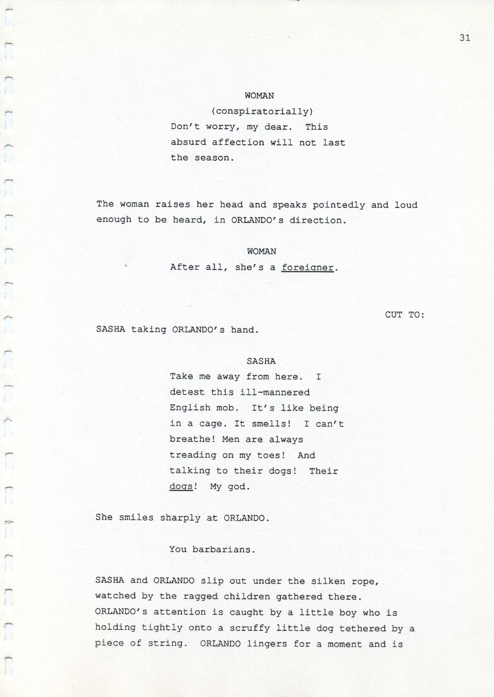 Description Page 31 of revised draft script for Orlando. Black printed text on A4 paper bound with a plastic comb spine