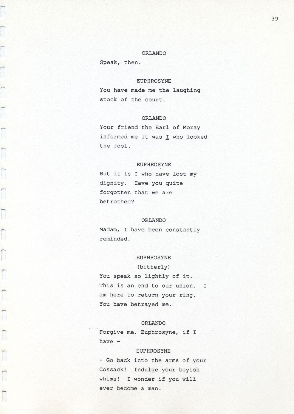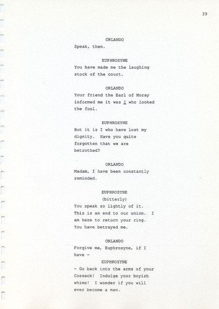 Description Page 39 of revised draft script for Orlando. Black printed text on A4 paper bound with a plastic comb spine