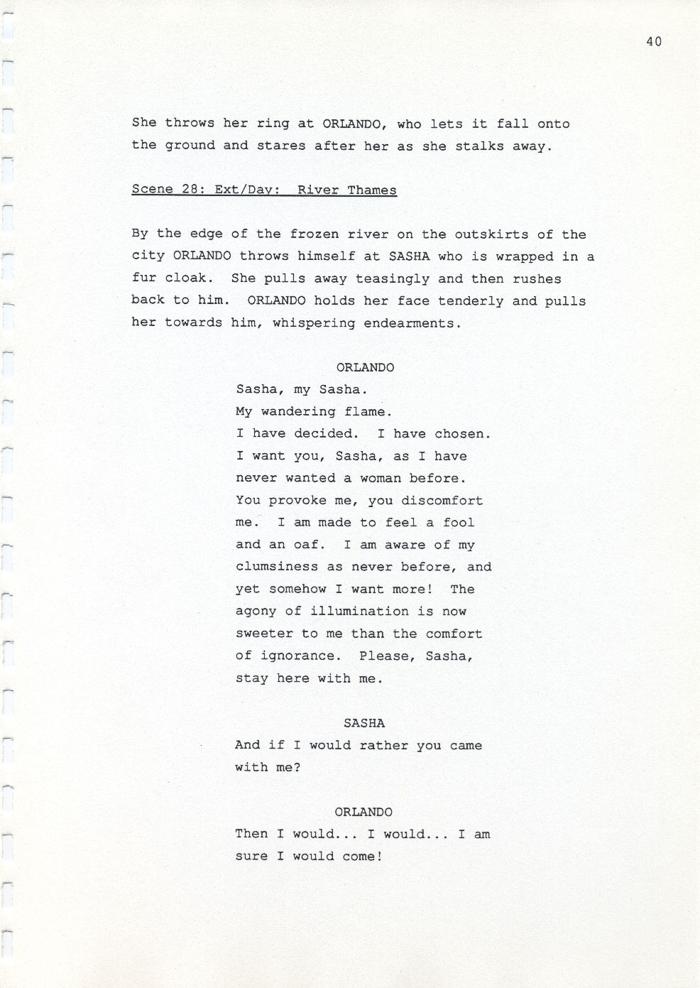 Description Page 40 of revised draft script for Orlando. Black printed text on A4 paper bound with a plastic comb spine
