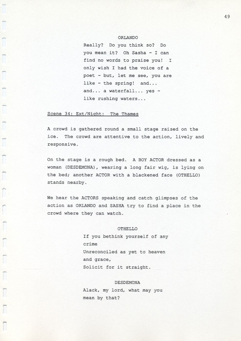 Description Page 49 of revised draft script for Orlando. Black printed text on A4 paper bound with a plastic comb spine