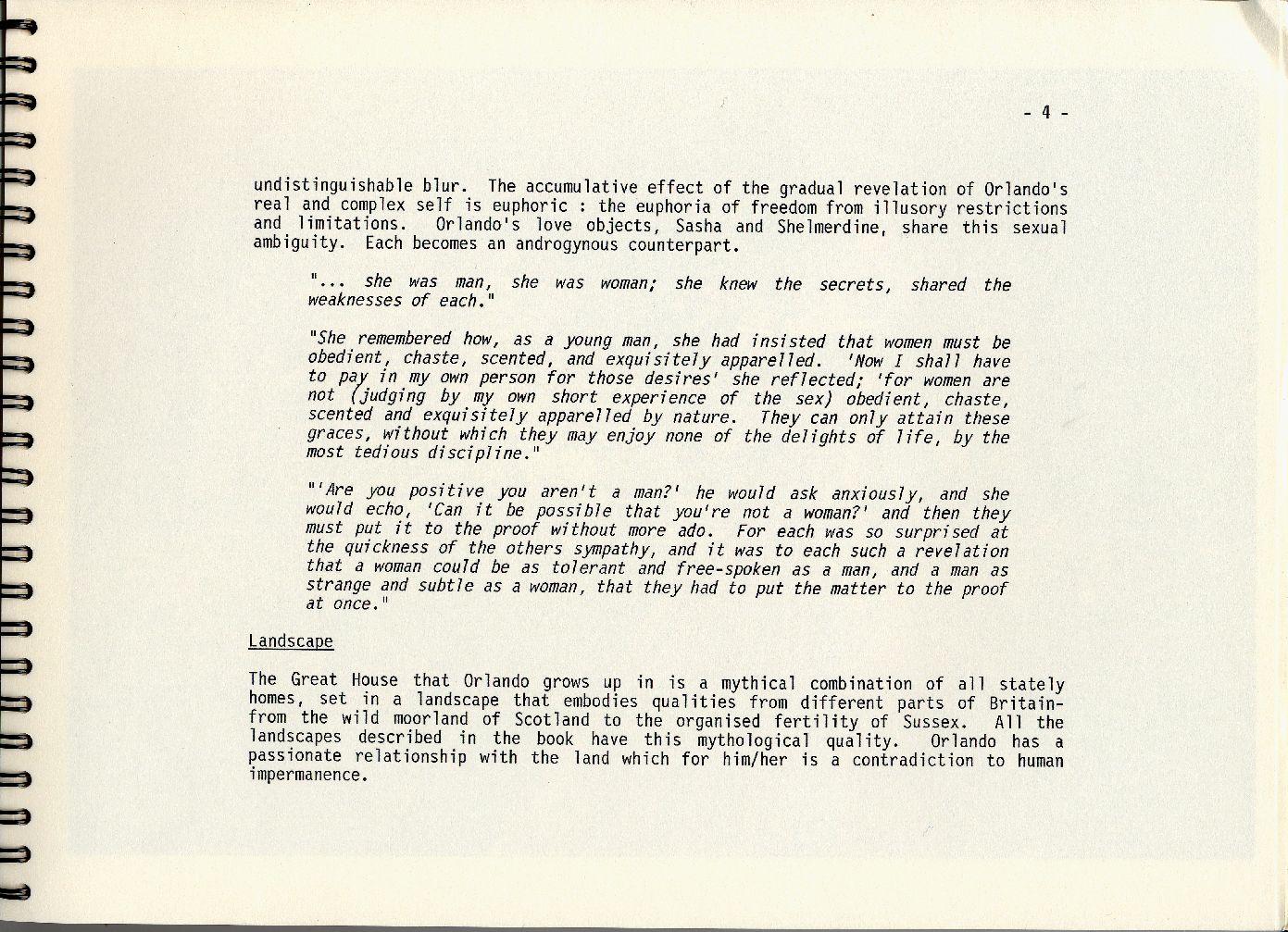 An exploration of intertextuality in Orlando through themes of gender and identity. I have chosen this approach as the most obvious, yet complex and interesting theme in Sally Potter's and Virginia Woolf's work. Same person/Same story. No difference. Just a different sex/Just a different medium.