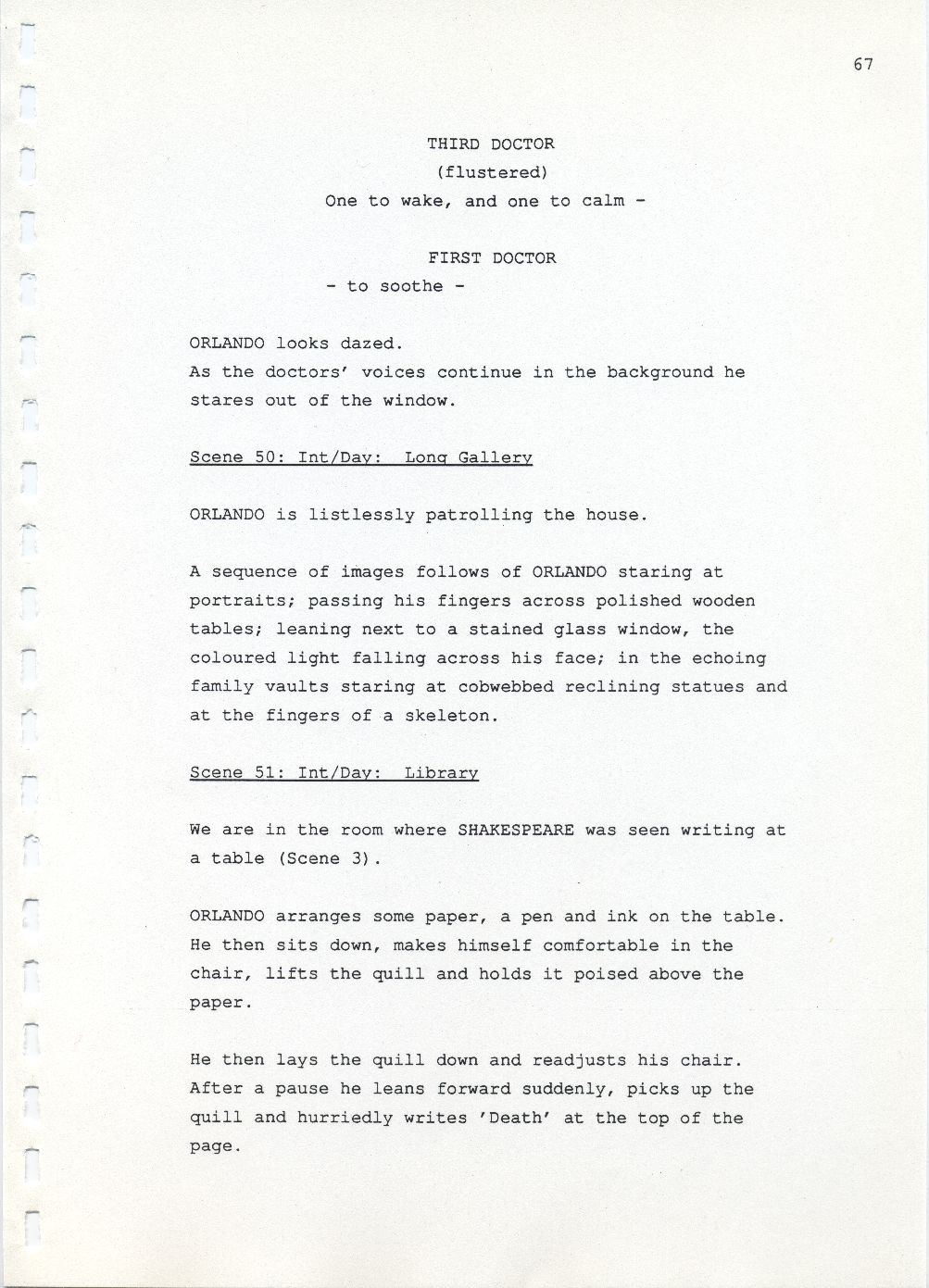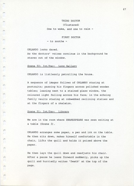 Description Page 67 of revised draft script for Orlando. Black printed text on A4 paper bound with a plastic comb spine