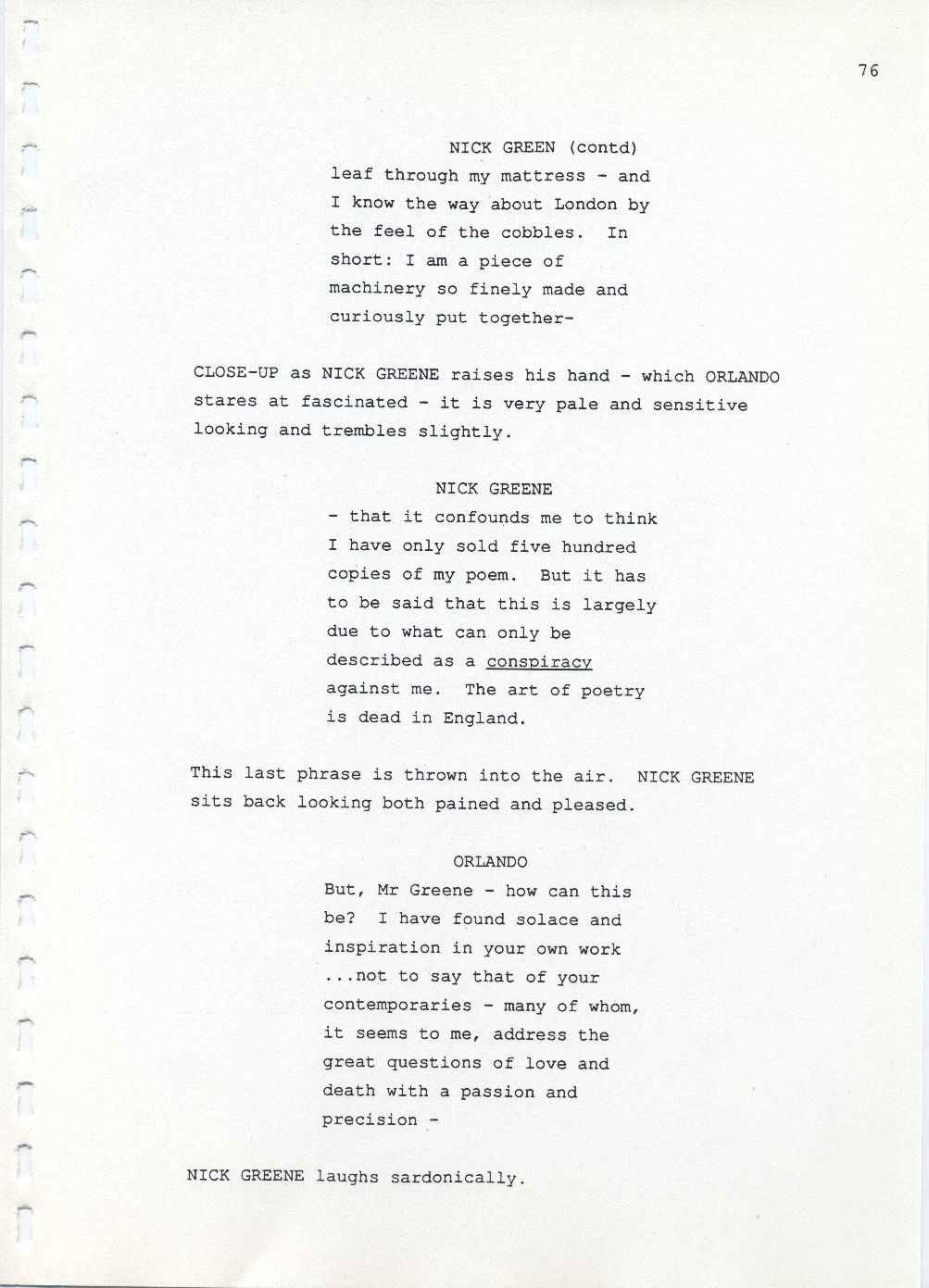 Description Page 76 of revised draft script for Orlando. Black printed text on A4 paper bound with a plastic comb spine