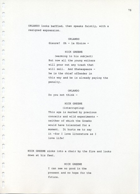 Description Page 78 of revised draft script for Orlando. Black printed text on A4 paper bound with a plastic comb spine
