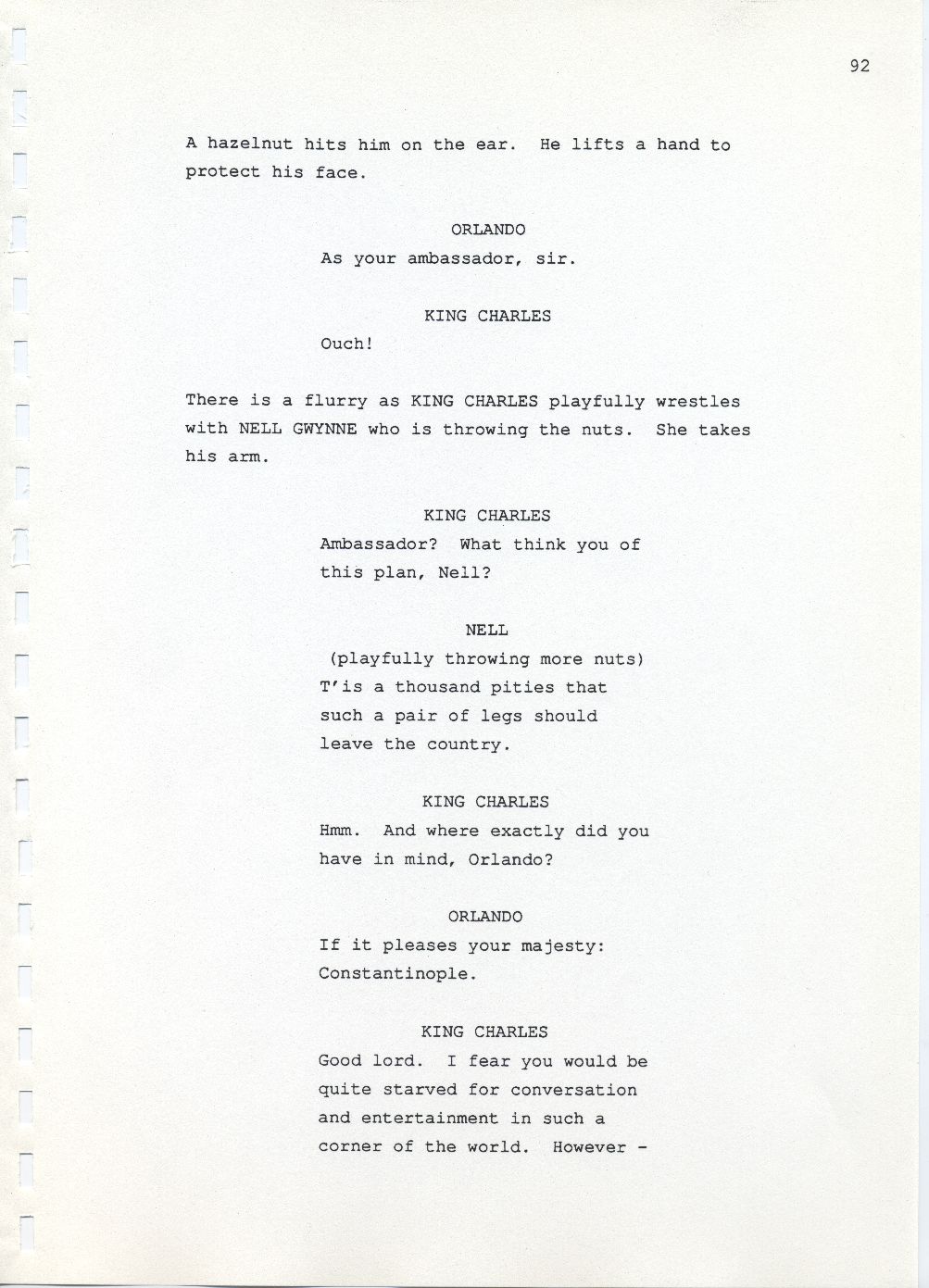 Description Page 92 of revised draft script for Orlando. Black printed text on A4 paper bound with a plastic comb spine