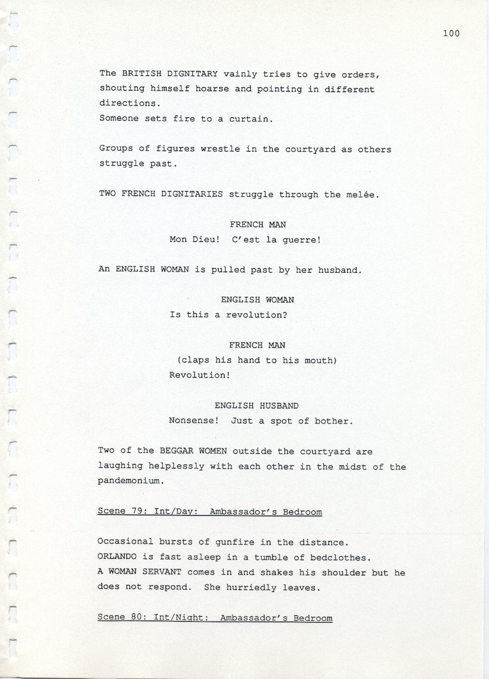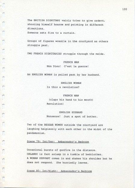 Description Page 100 of revised draft script for Orlando. Black printed text on A4 paper bound with a plastic comb spine