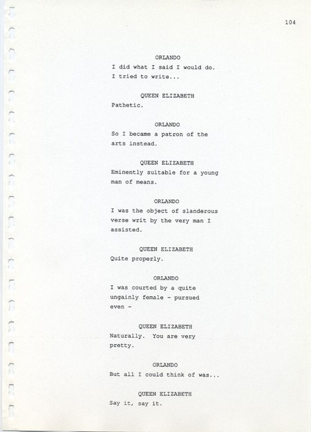 Description Page 104 of revised draft script for Orlando. Black printed text on A4 paper bound with a plastic comb spine