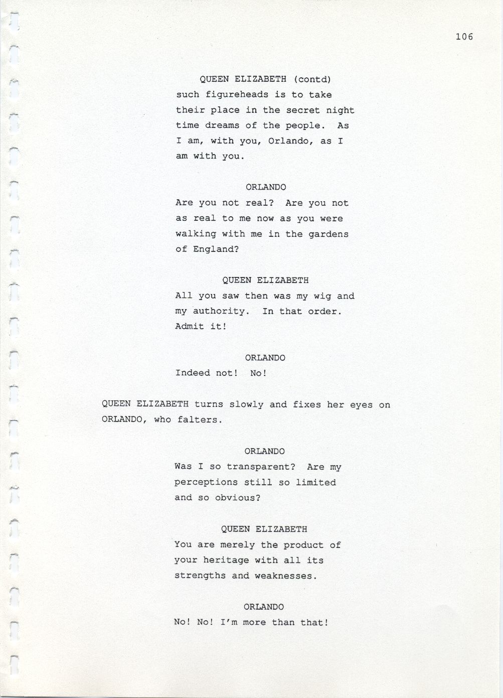 Description Page 106 of revised draft script for Orlando. Black printed text on A4 paper bound with a plastic comb spine