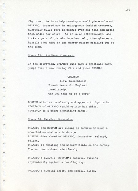 Description Page 109 of revised draft script for Orlando. Black printed text on A4 paper bound with a plastic comb spine