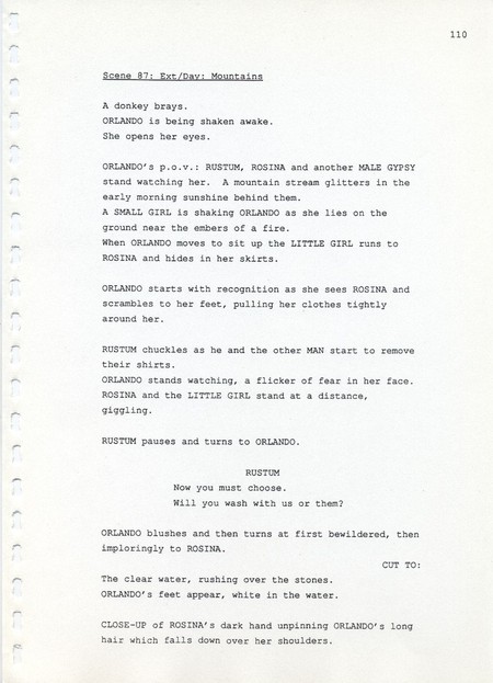 Description Page 110 of revised draft script for Orlando. Black printed text on A4 paper bound with a plastic comb spine