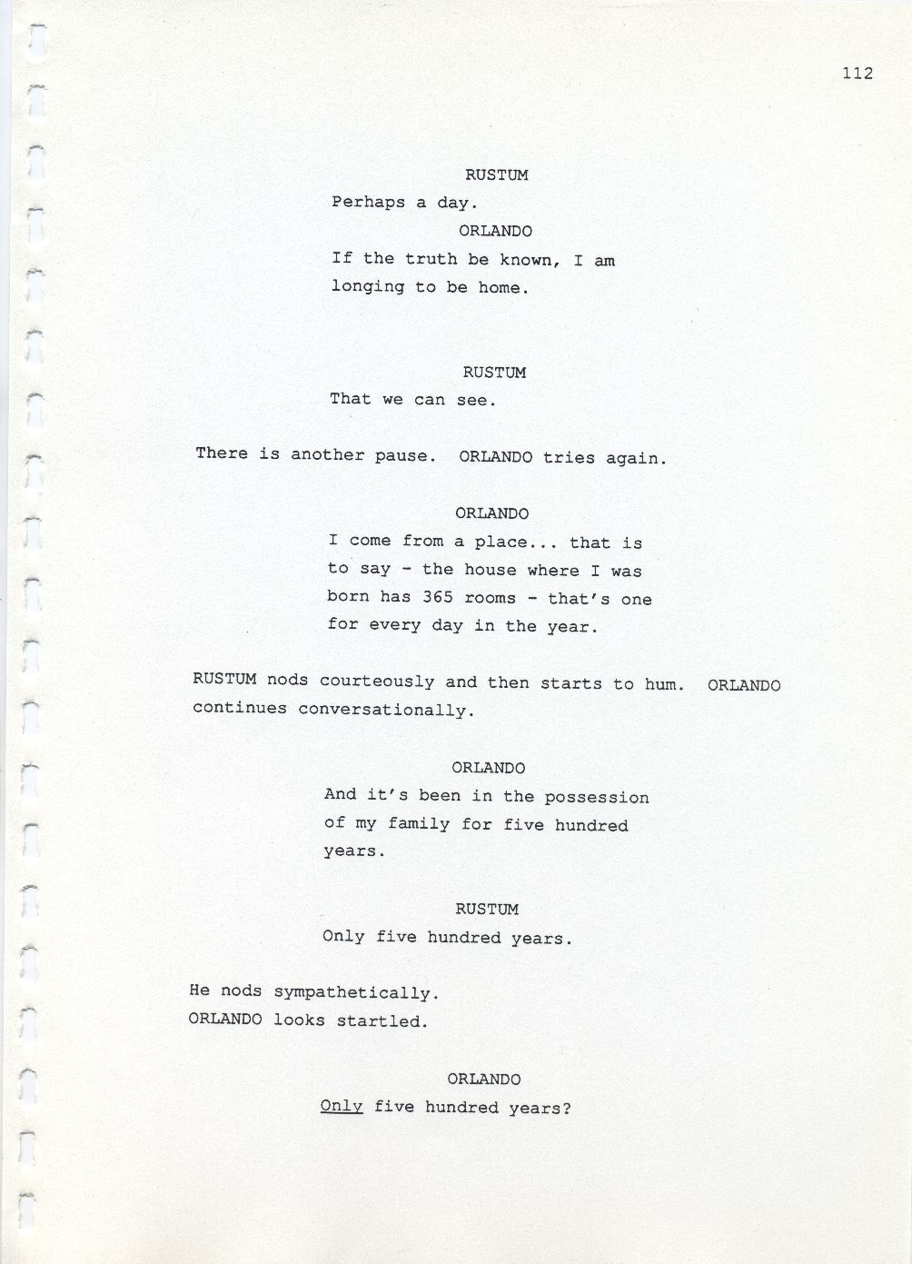 Description Page 112 of revised draft script for Orlando. Black printed text on A4 paper bound with a plastic comb spine