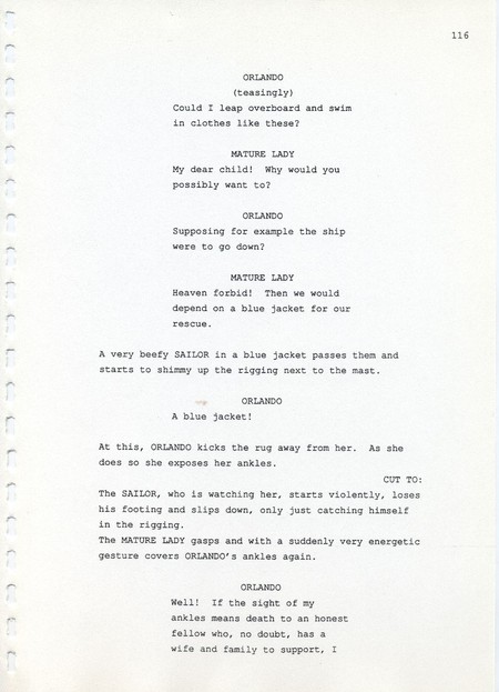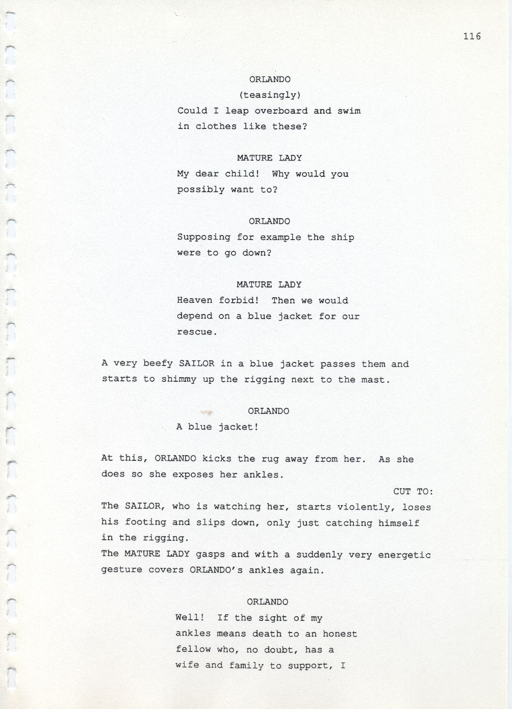 Description Page 116 of revised draft script for Orlando. Black printed text on A4 paper bound with a plastic comb spine